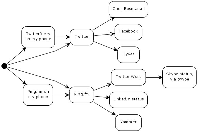 A while back I connected my accounts of several social networks and tools to each other. If I update my 'status' in one place it shows up in the others automatically. So if I type a status update on my phone, it gets routed to my website, to Facebook and to Hyves (a Dutch Facebook clone).