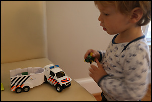 We had a minor social event this morning. Over breakfast Adrian was playing with the police car (a $0.50 purchase at King's Day) and the police horse carrier (a gift from Opa & Oma that has survived rough treatment pretty well).