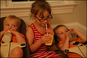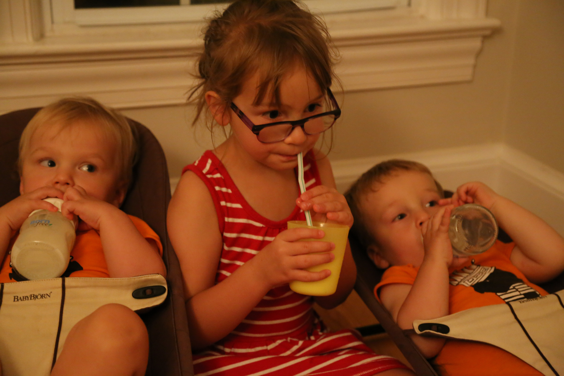 Before the boys go to bed, they drink their bottler in their bouncy chairs.
