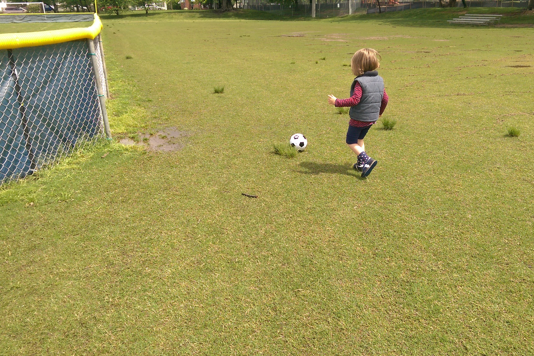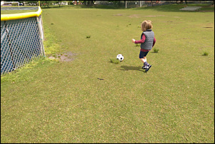 Yesterday's session -- her second -- was cancelled due to the rain. Today we kicked the ball for a while, it was fun. We we went by bike and afterwords we went to Trader Joe's.