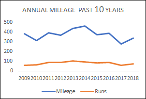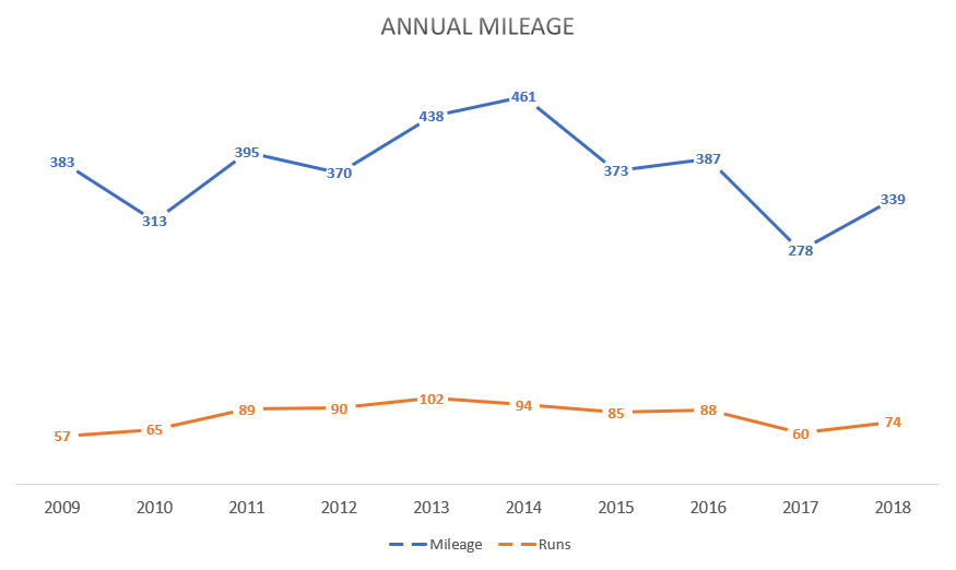 I started tracking my mileage and speeds in January 2009 and have been faithfully recording my runs since then: a combined 3,737 miles during 804 runs. In an average year I ran 80 times, with an average length of 4.7 miles.
