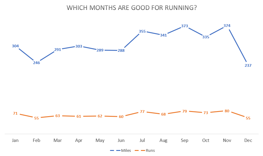 • July through November is clearly the best period for running for me. December and February the worst -- funny enough January isn't too bad, the New Year's resolution effect I guess.