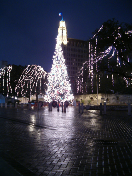 Picture of the Christmas tree in front of The Alamo, and in the background our hotel on the last night of our stay.
