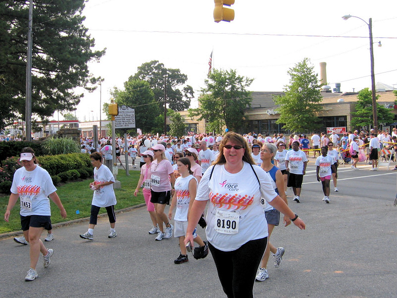 It was an impressive and emotionally charged event. It's an important fund raiser for the Susan G. Komen for the Cure foundation, to support research and prevention of breast cancer. There were a total of 30,000 people running and walking (2,600 in the competitive race), and a large number of women in pink survivor shirts. It was clearly not just a race for time, it was a race for a cause. The organization was superb, with clocks at each mile, two water stands at the course and at the finish, and tons of people cheering for the participants.