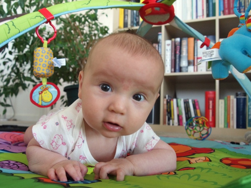 Every day she spends more time on her tummy, and she's really getting better and better at holding up her head. There are even some early experiments on learning how to turn.