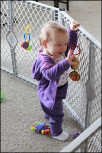 Nora is learning how to stand. She uses her baby fence for support and can stand for long periods of time, even with using just one hand.
