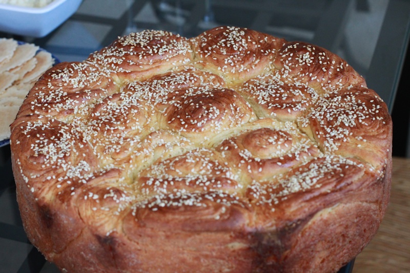 We had blueberry scones for breakfast and when I came back from picking up the cake Jonathan and the kids had just arrived. We made a birthday hat for Nora and prepared the lunch. Nadia had baked a special pitka, a Bulgarian bread for parties, which turned out great.
