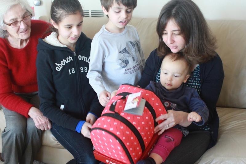 Nora opened her presents. She was particularly happy with a plush dog in a plush doghouse.