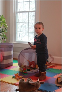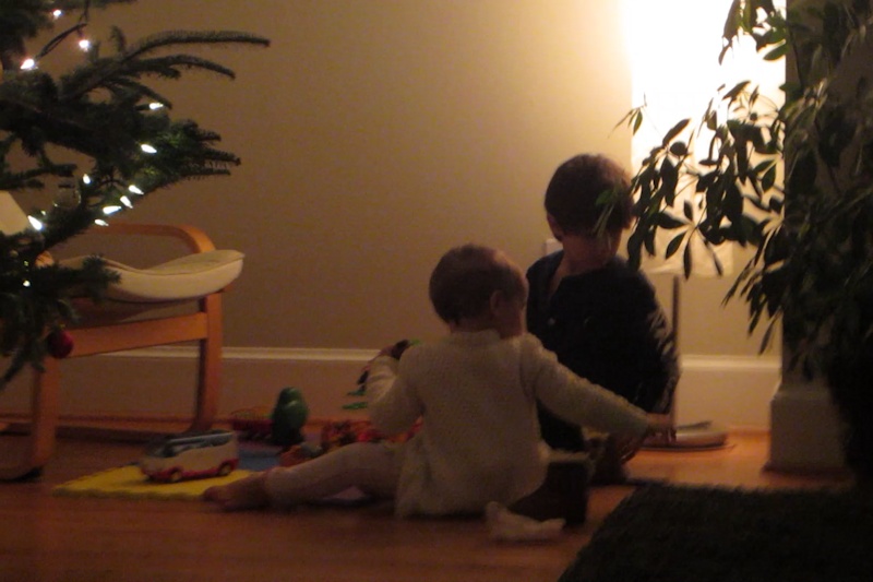 Nora really likes playing with her cousins. Sometimes from a safe distance -- there can be a lot of noise! -- and sometimes close by. To communicate with Julian she has to speak English and slowly but surely she is making some progress.
