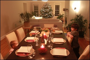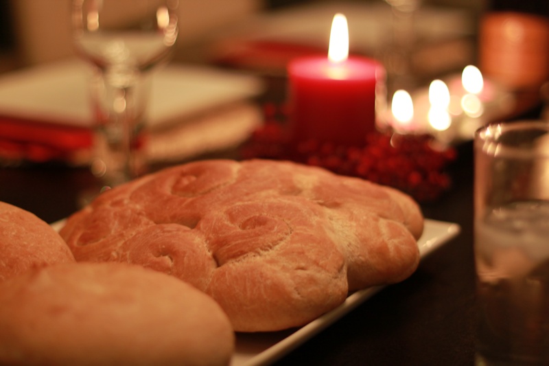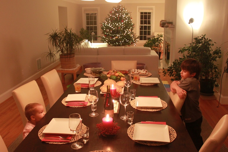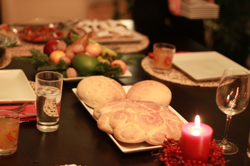 Budni vecher is always a special meal and evening, and we had a nice selection of vegan dishes. Surmichki, two types of beans and salads. We made three pitka's: one big bread and two small pitka to break. In our family Sasha got the coin -- Julian was the lucky one at the Zanes.