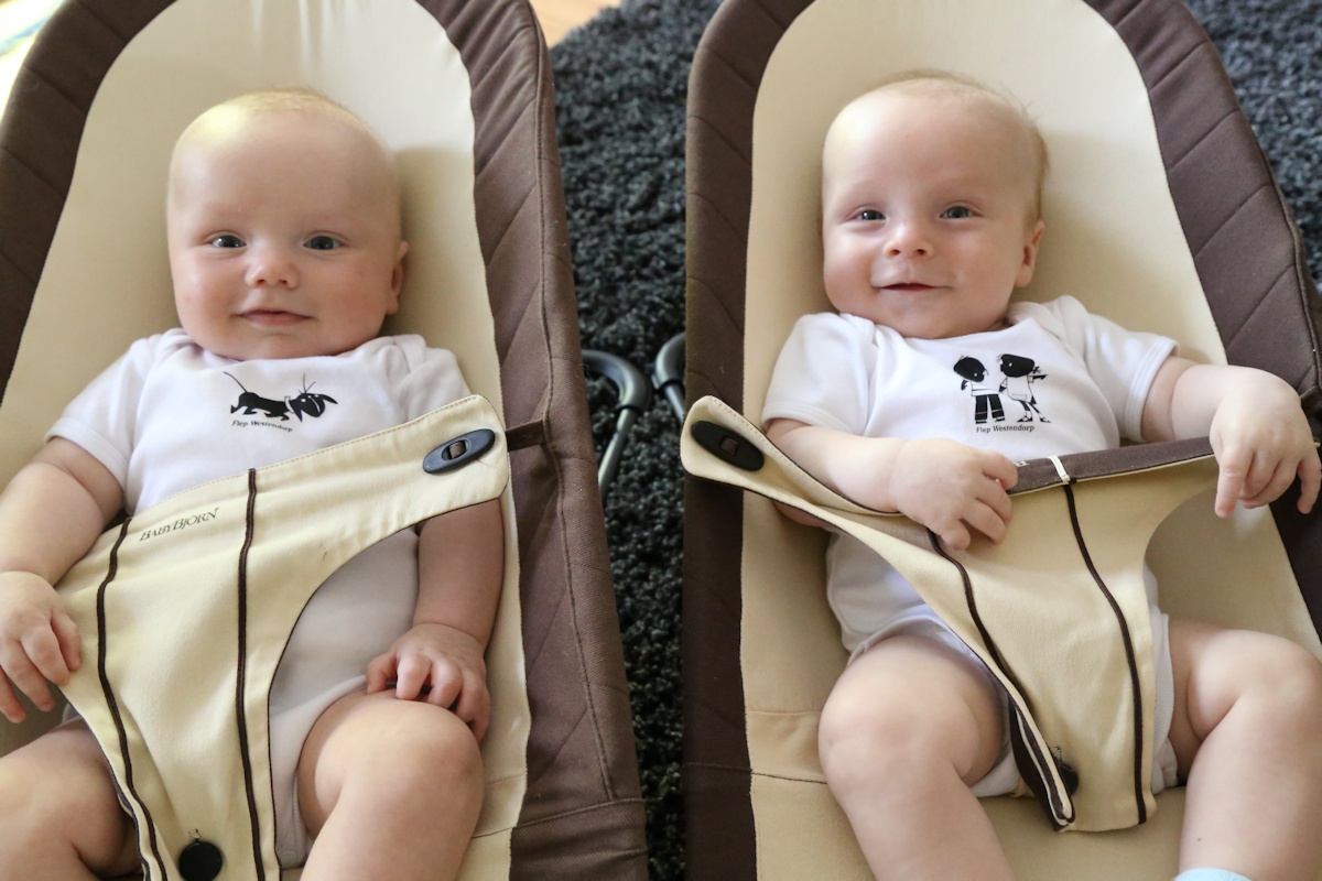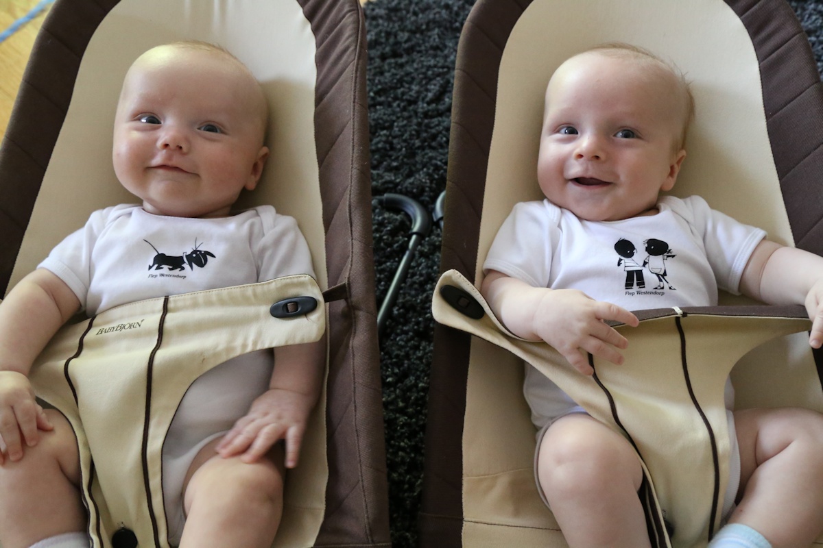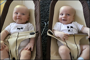 Leo and Adrian will be 100 days old tomorrow! As I'm writing this they are sitting in their bouncy chairs, smiling at me. They will nap soon.