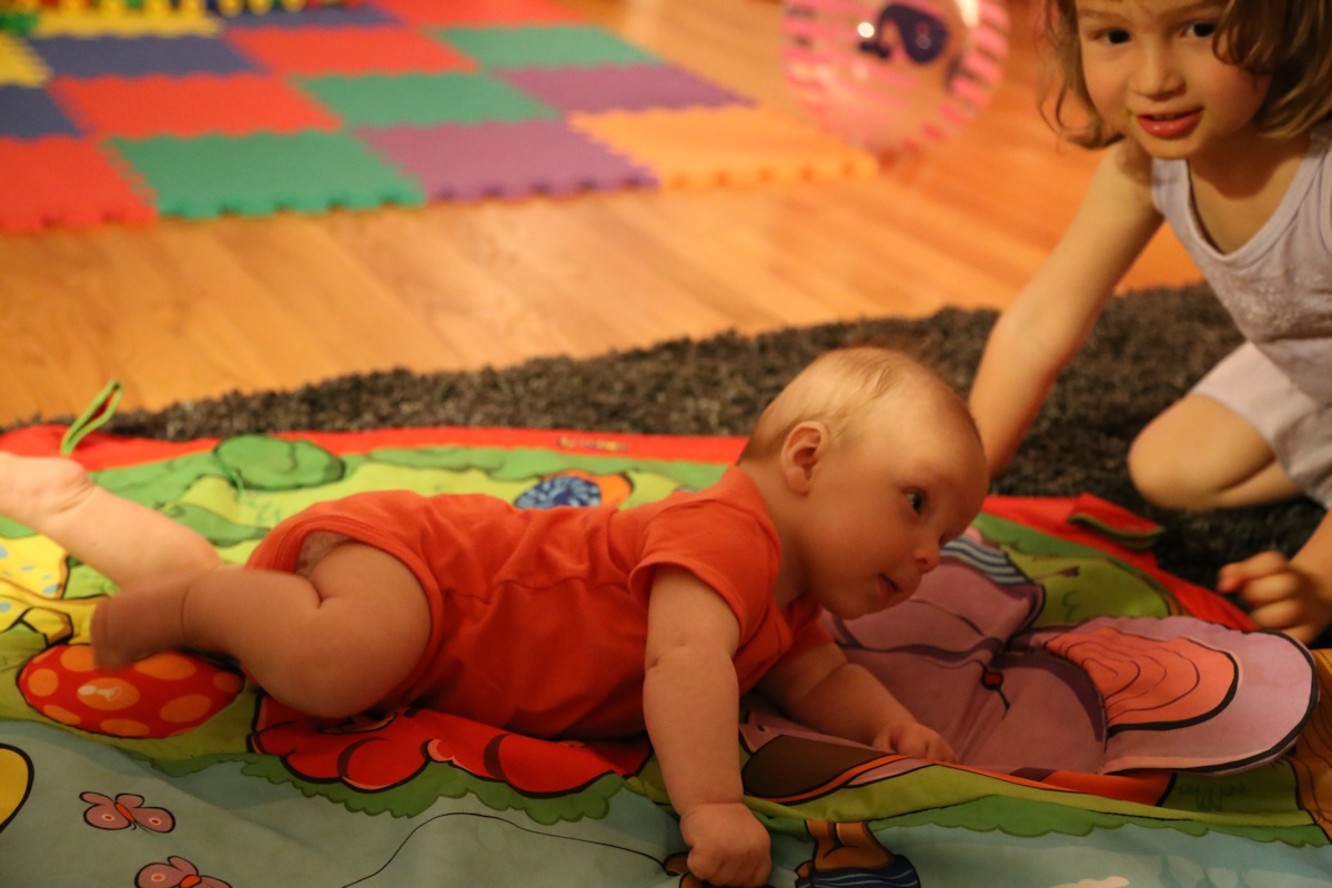 Tonight we placed the boys on the play mat for some tummy time and Leo started rolling over from his tummy to his back. He must have liked it because he did it five or six times in a row, much to our delight.