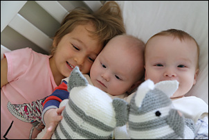 Every now and then the boys are smiling at each other, especially now that they're in highchairs. And when they drop a toy, Nora will pick it up and give it back: "hier, jongen!"