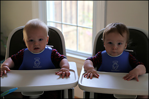 They both start saying or repeating words. It's very early of course, but the beginning is there. When they are sitting in their chairs, and we come to them to pick them up, they'll lift their arms in anticipation. Leo loves clapping his hand and seeing people's reactions. He responds to both kun jij klappen? as well as плашкай рьчички which is quite hopeful. Pretty sure he says "klap" too. On 12/19 Adrian clapped as well, after we were talking with Leo and he was showing his skills.
