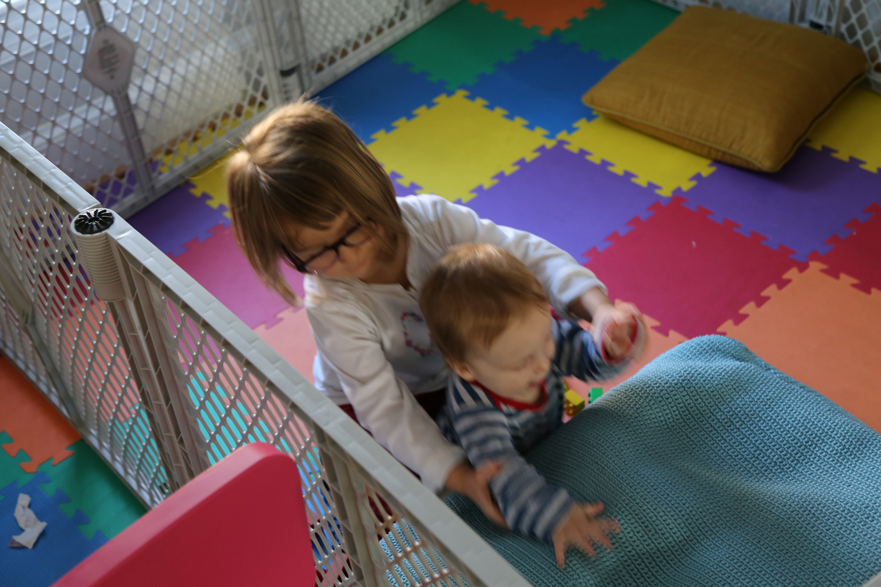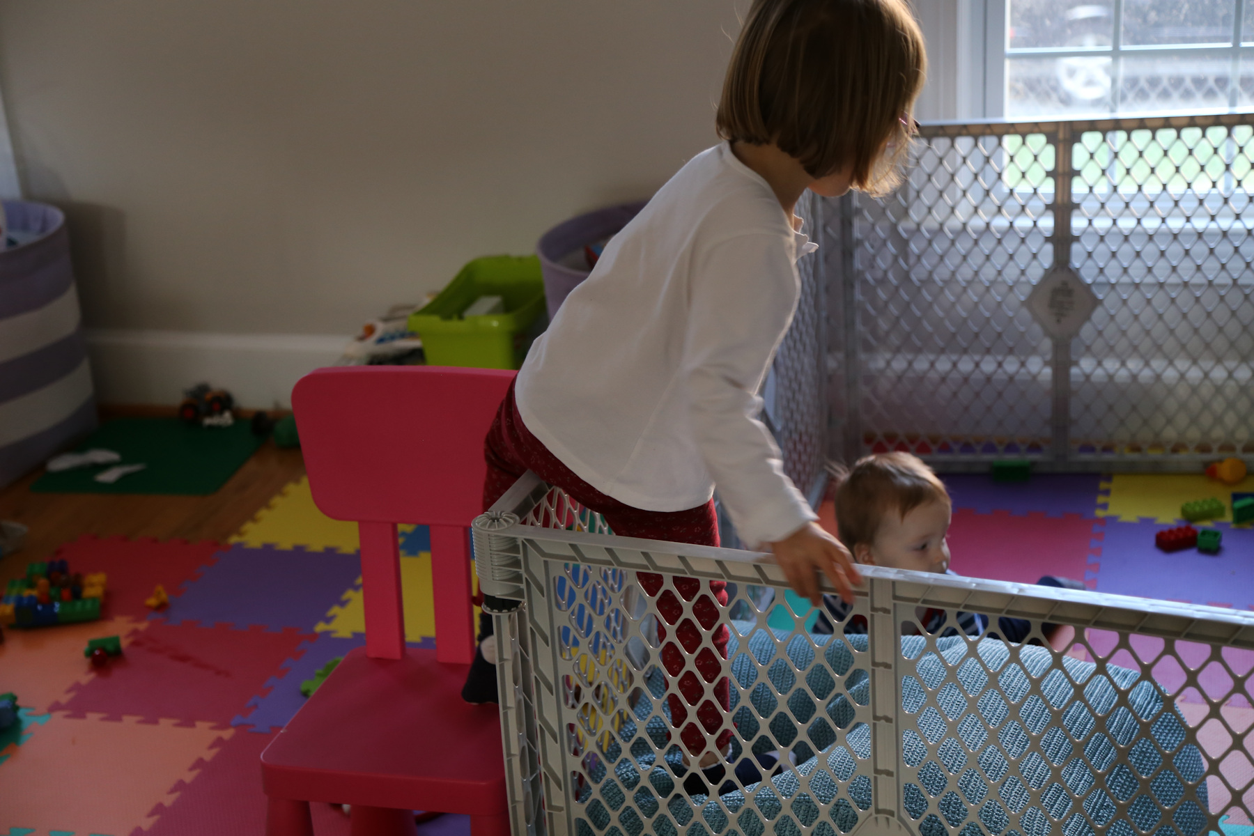 Leo is now capable of kicking open the cage when we leave it half-open so we had to start fully closing it. Nora wanted a way in and out of the cage which we provided.