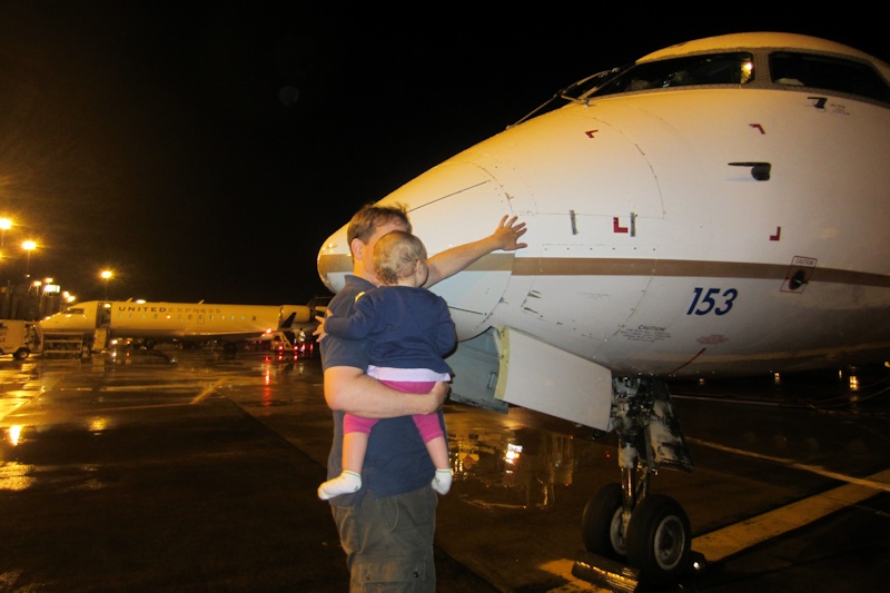 On the way back we waited outside the plane for the stroller to be unloaded. It took a little longer and Nora and I touched the front of the plane, which she referred to as "boot" as well.