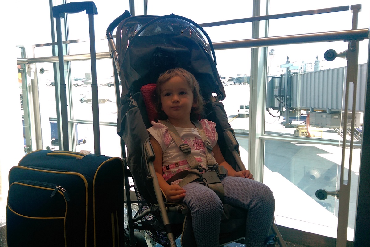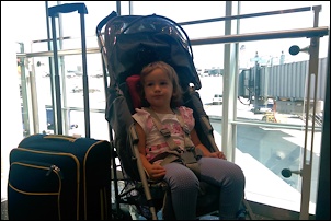 The lady at the check-in counter was very friendly and let us check in the car seat for free, which meant that we could check in one of the small suitcases as well. That saved a lot of hassle. Over-all, we carried a lot of luggage: 50 kilogram (110 lbs) for checked-in, plus a big car seat, a stroller, a carry-on suitcase and some small items.