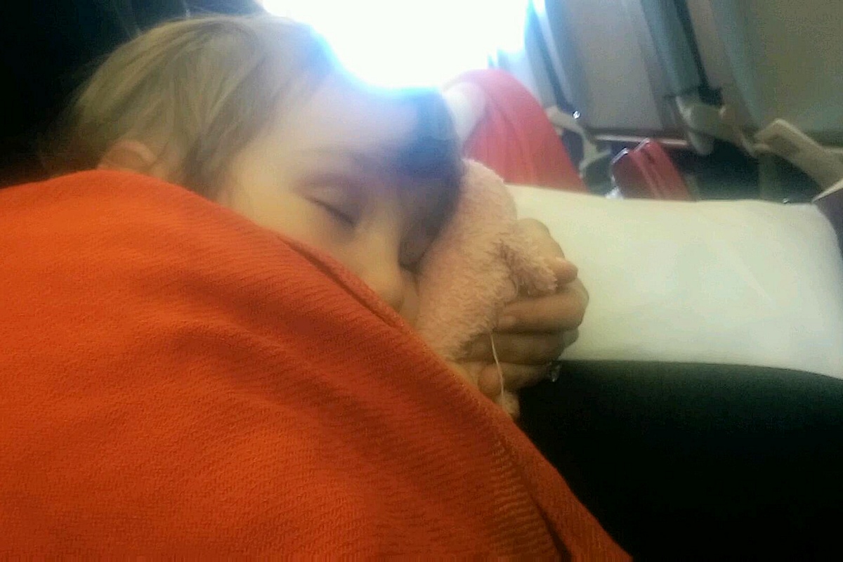 The second flight departed at 12:20 pm. In the waiting area we chatted with a small boy and at one point Nora told him in English: "Nora sleep in the plane". And before we were airborne she put her head in Sasha's lap and fell asleep, and slept for a solid three hours.