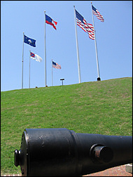 The flag on Fort Sumter, including an old Confederate Flag, old flags of the United States (with less stars than today) and the South Carolina flag. The flag of the United States is the largest of them.