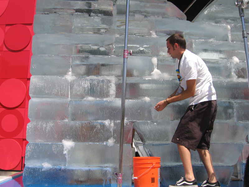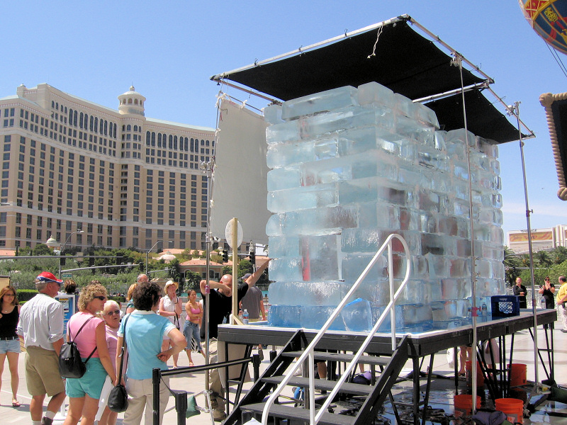 There are 4 show girls inside also, "to keep him warm". The girls leave the ice every 4 hours, the magician plans to stay for 24 hours. The ice needs constant maintenance.