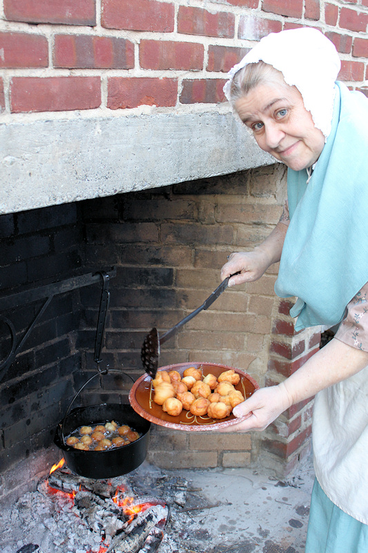 Saint Nicholas stayed for about an hour. Children had the opportunity to pet his horse and feed it carrots. There were also demonstration of how to make candles and how to make sauerkraut. Inside a lady was spinning flax, and to the delight of this correspondent outside fresh "oliekoecks" or "oliebollen" were served.