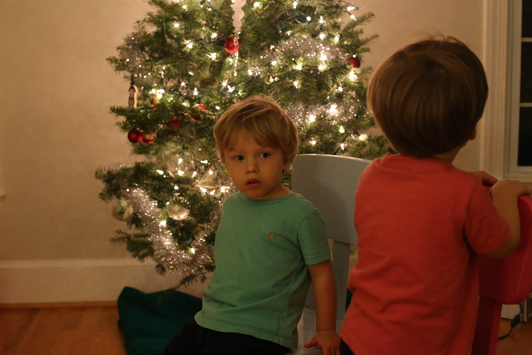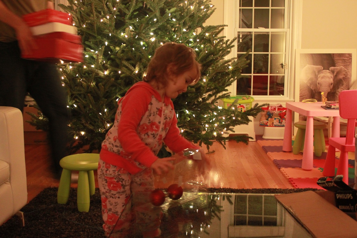 In the morning the boys were downstairs for a while... then I saw Adrian walking around with a dustpan. When I asked what happened, Leo explained that they were kicking the big blue exercise ball, it bounced off the fireplace and then hit the tree and broke one of the Christmas balls. "We waren erg geschrokken", said Leo. Other than that, no damage so far.